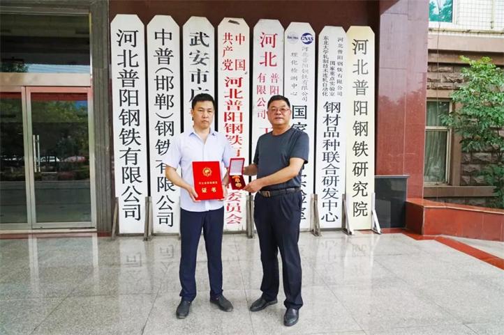 7月17日上午,武安市工會常務副主席王啟良領導一行來到普陽鋼鐵,為普陽黨委副書記、總經理石躍強頒發“河北省勞動模范”獎章及榮譽證書。公司總經理石躍強和辦公室主任楊建軍進行了熱情接待。