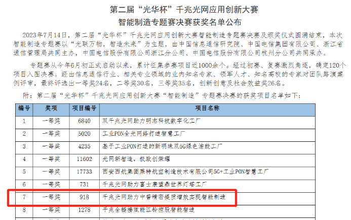 ?? “光華杯”千兆光網應用創(chuàng)新大賽是工業(yè)和信息化部重要的年度賽事,旨在推動千兆光網技術在各個領域的創(chuàng)新應用。本次智能制造專題賽經歷了初賽、復賽和決賽三輪比拼,由信息通信行業(yè)及相關專業(yè)領域的知名專家、行業(yè)領軍人才、知名大學教授等嚴格評審,中普精密的項目在120個決賽項目中經過激烈的競爭脫穎而出,獲得了專家的高度認可。