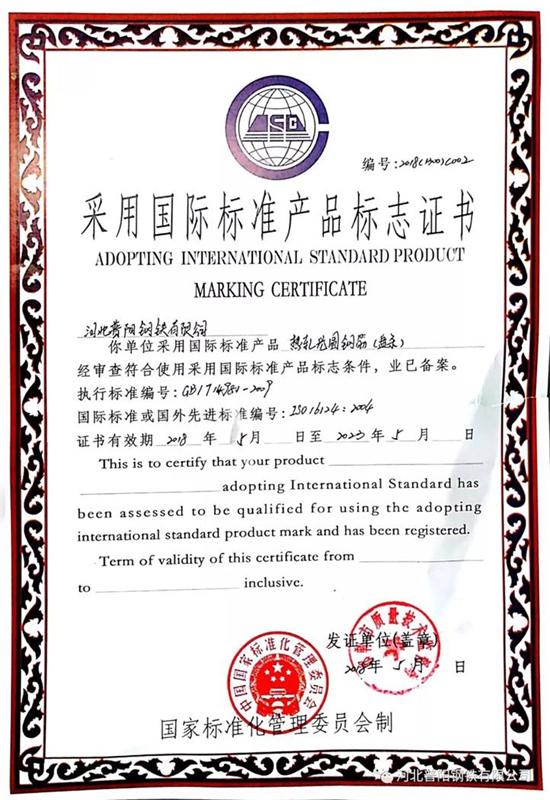 近日,經(jīng)過國家標(biāo)準(zhǔn)化管理委員會、河北省質(zhì)量技術(shù)監(jiān)督局的嚴(yán)格檢驗以及行業(yè)專家對產(chǎn)品實物質(zhì)量與國外同類產(chǎn)品質(zhì)量性能指標(biāo)的比較評估,核定我公司生產(chǎn)的熱軋光圓鋼筋(盤條)指標(biāo)完全符合國際標(biāo)準(zhǔn)要求,質(zhì)量達(dá)到國際先進(jìn)水平,國家標(biāo)準(zhǔn)化管理委員會、河北省質(zhì)量技術(shù)監(jiān)督局特授予《采用國際標(biāo)準(zhǔn)產(chǎn)品標(biāo)志證書》和《采用國際標(biāo)準(zhǔn)認(rèn)可證書》。這標(biāo)志著我公司的熱軋光圓鋼筋(盤條)順利通過“雙采”認(rèn)證。