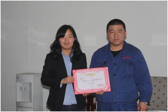 2013年“迎五一”體育比賽圓滿落下帷幕。此次比賽得到了各單位的大力支持,各參賽選手以自己精彩的表現,體現了普陽人“團結、拼搏、向上”的精神風貌,得到了公司領導及廣大工友的一致贊譽。5月7日下午,辦公室主任石現英代表公司為優勝的單位和個人頒發了獎金和證書。圖為石現英與焦化廠領獎代表的合影。