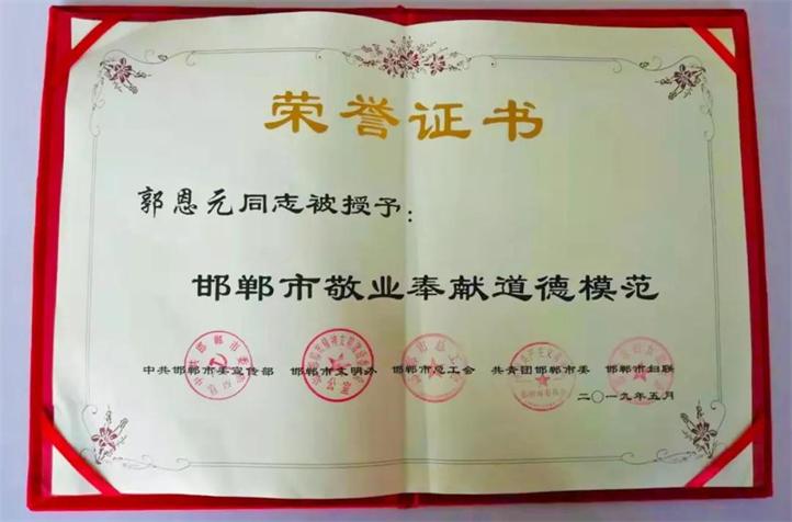近日,由邯鄲市委宣傳部、市文明辦、市總工會、團市委、市婦聯聯合舉辦的“邯鄲市第七屆道德模范頒獎典禮暨2019年度新時代好少年先進事跡發布會”,在市廣播電視臺演播大廳舉行。會議表彰了對推進全市精神文明建設做出突出貢獻的企事業單位和個人,全國十大杰出企業家、全國鋼鐵工業勞動模范、普陽鋼鐵集團黨委書記、董事長郭恩元榮獲“邯鄲市敬業奉獻道德模范”榮譽稱號。