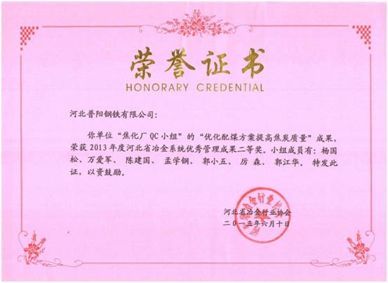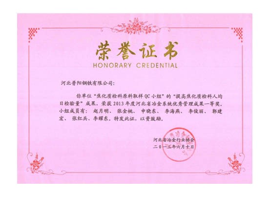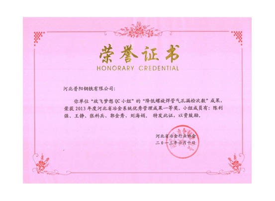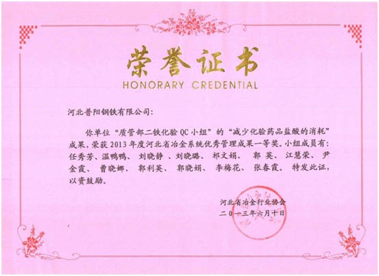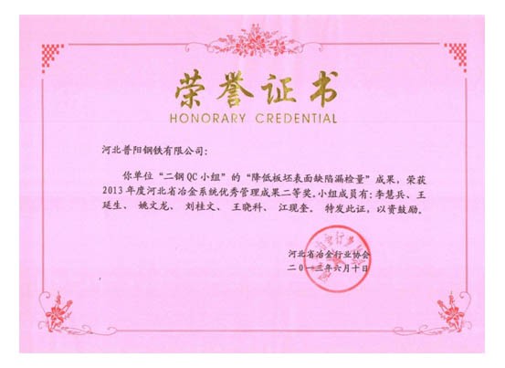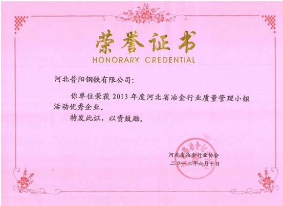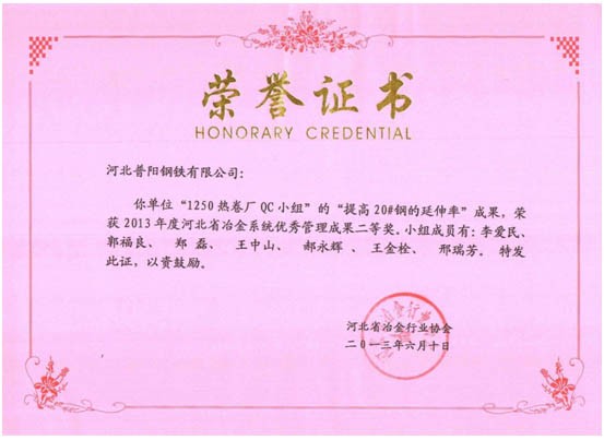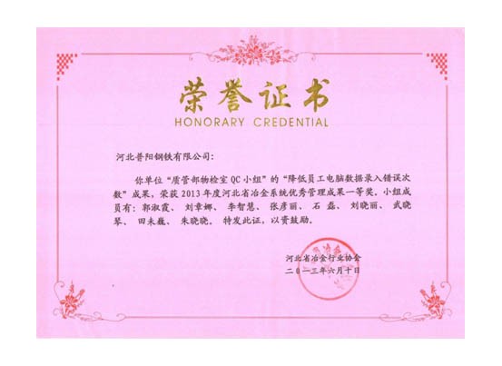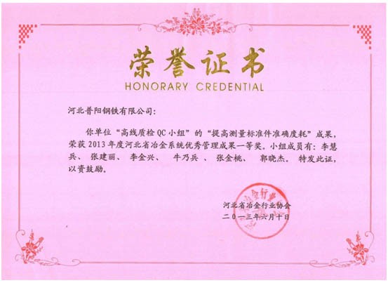 QC小組課題獲得了一等獎8個,二等獎3個的好成績,同時公司榮獲“2013年度河北省冶金行業質量管理小組活動優秀企業”的稱號。