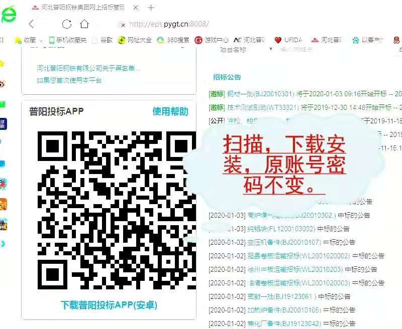 各位供應商合作伙伴,從下周起普陽鋼鐵招標網上報價和公眾號報價通道就已經關閉!!為保證以后招標的流程能順利進行,請下載"普陽投標APP"進行手機參與招標報價,原賬號密碼不變。目前只支持安卓版,有技術上問題請撥打0310-5178939。