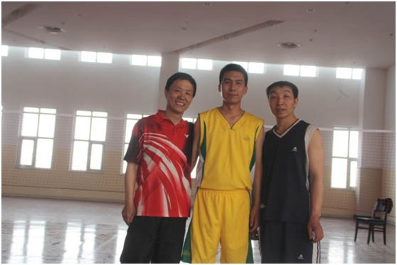 2013年“迎五一”男子羽毛球冠、亞季軍合影。左起依次為:亞軍陳建國、冠軍李延龍和季軍任志學(xué)。